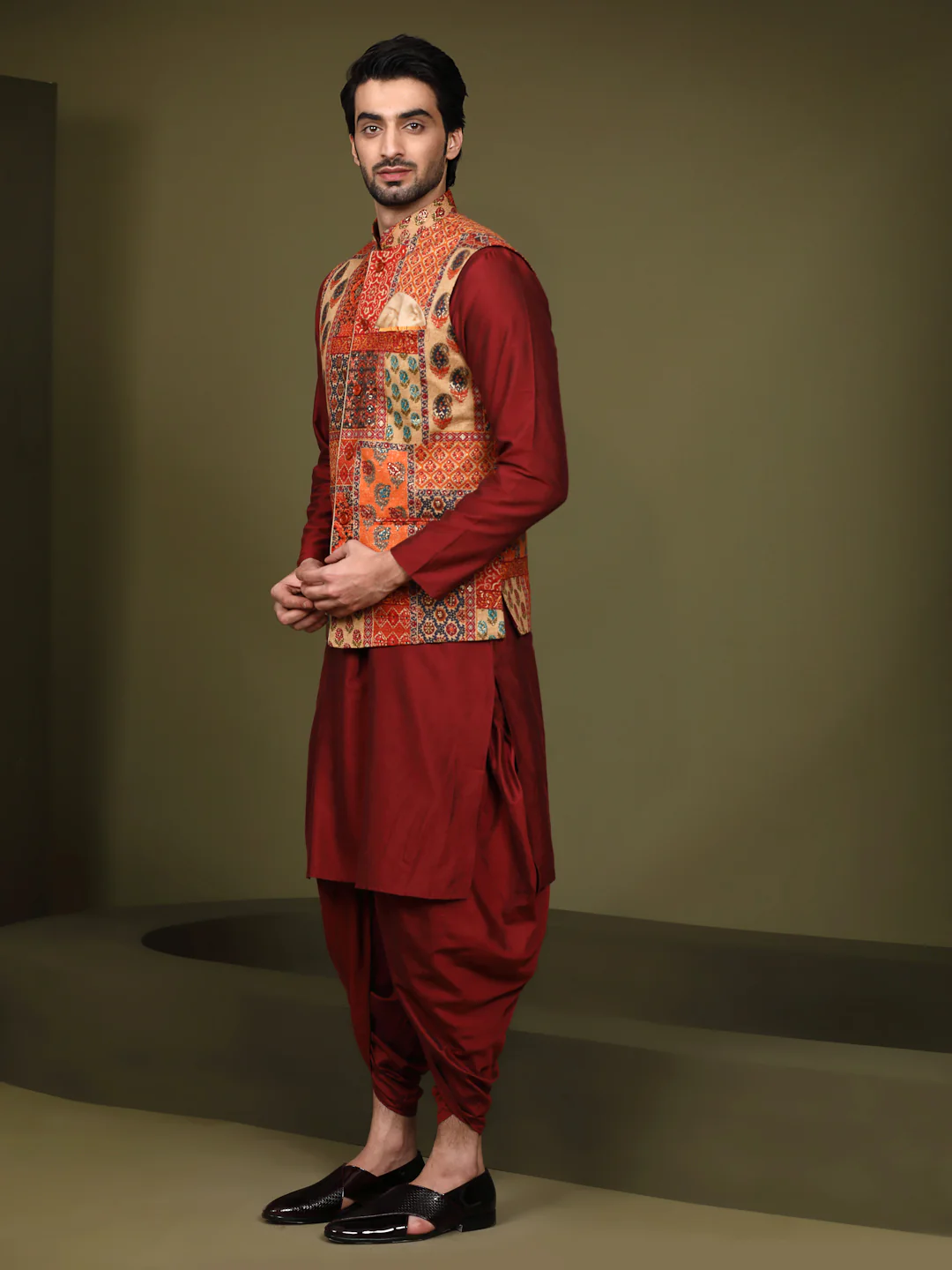 Multi Color Silk Blend Printed Jacket Kurta Dhoti Set