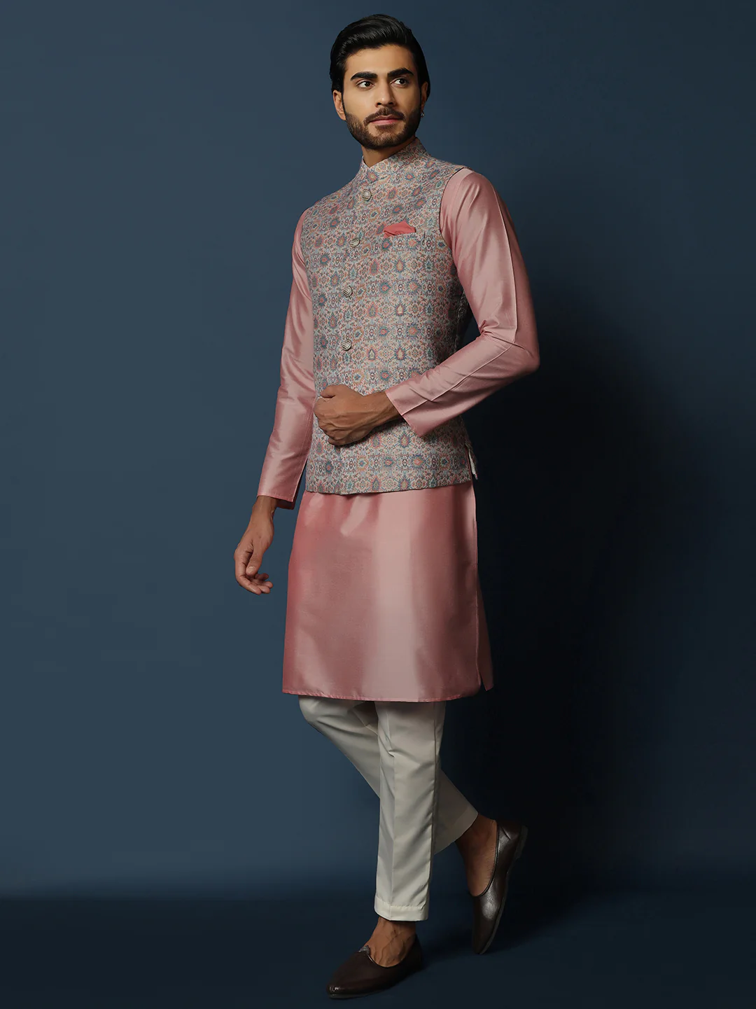 Grey Printed Silk Blend Nehru Jacket Kurta Trouser Set