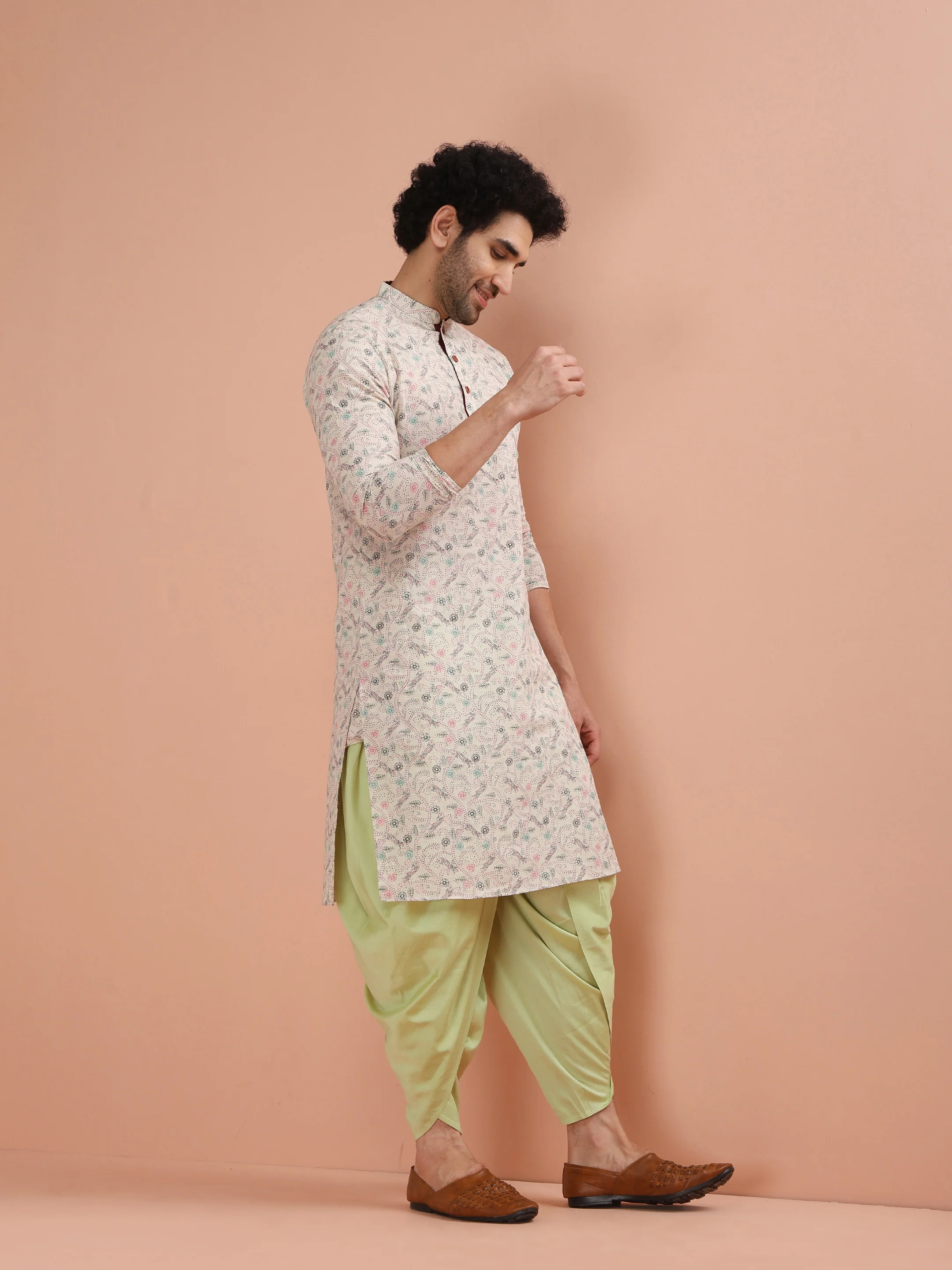 Beige Cotton Kurta Set with Multicolor Kantha-Inspired Prints and Green Dhoti Pants