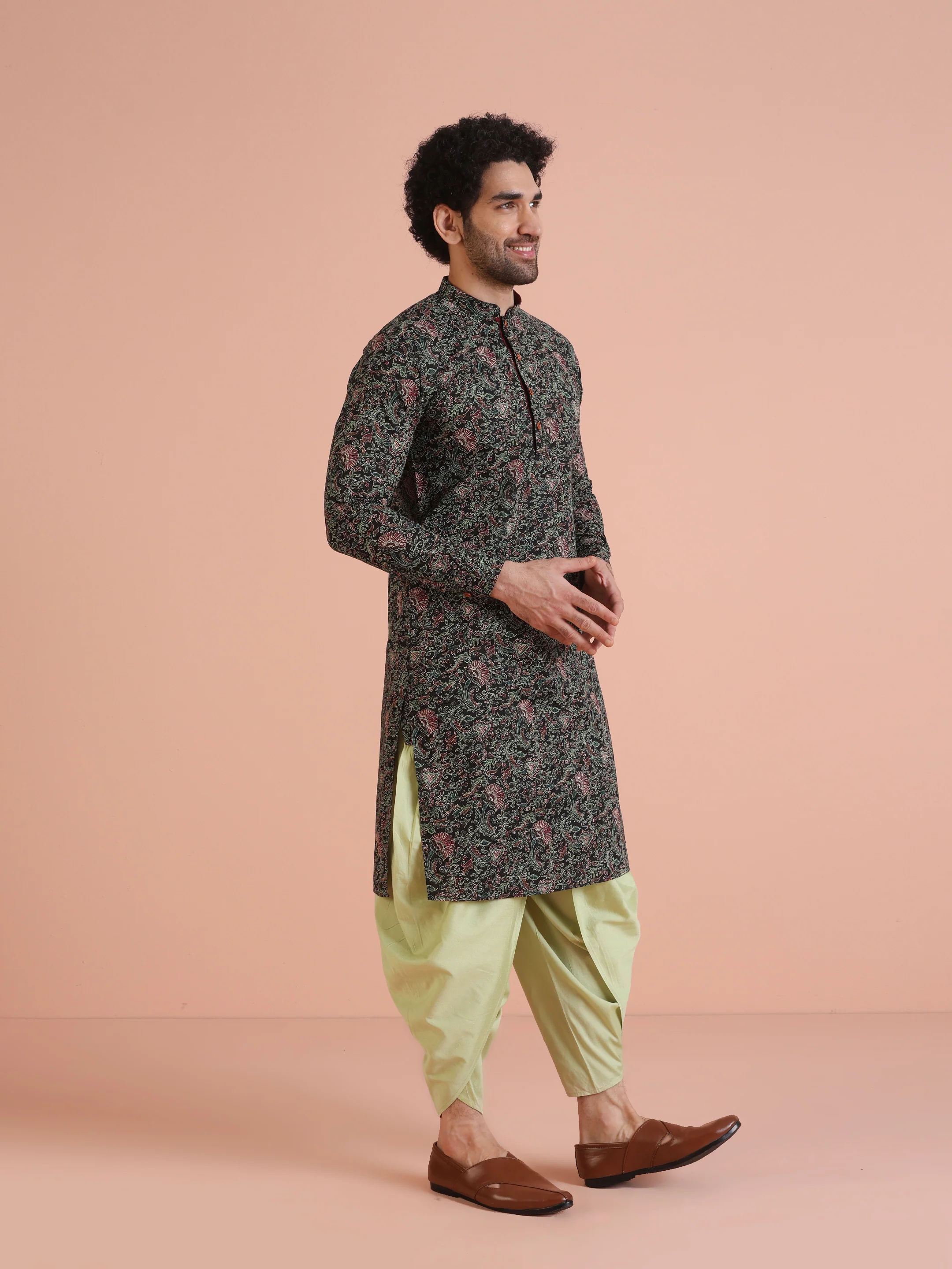Men Black Multi-Color Paisley Printed Kurta Dhoti Set – Elegant Festive Wear