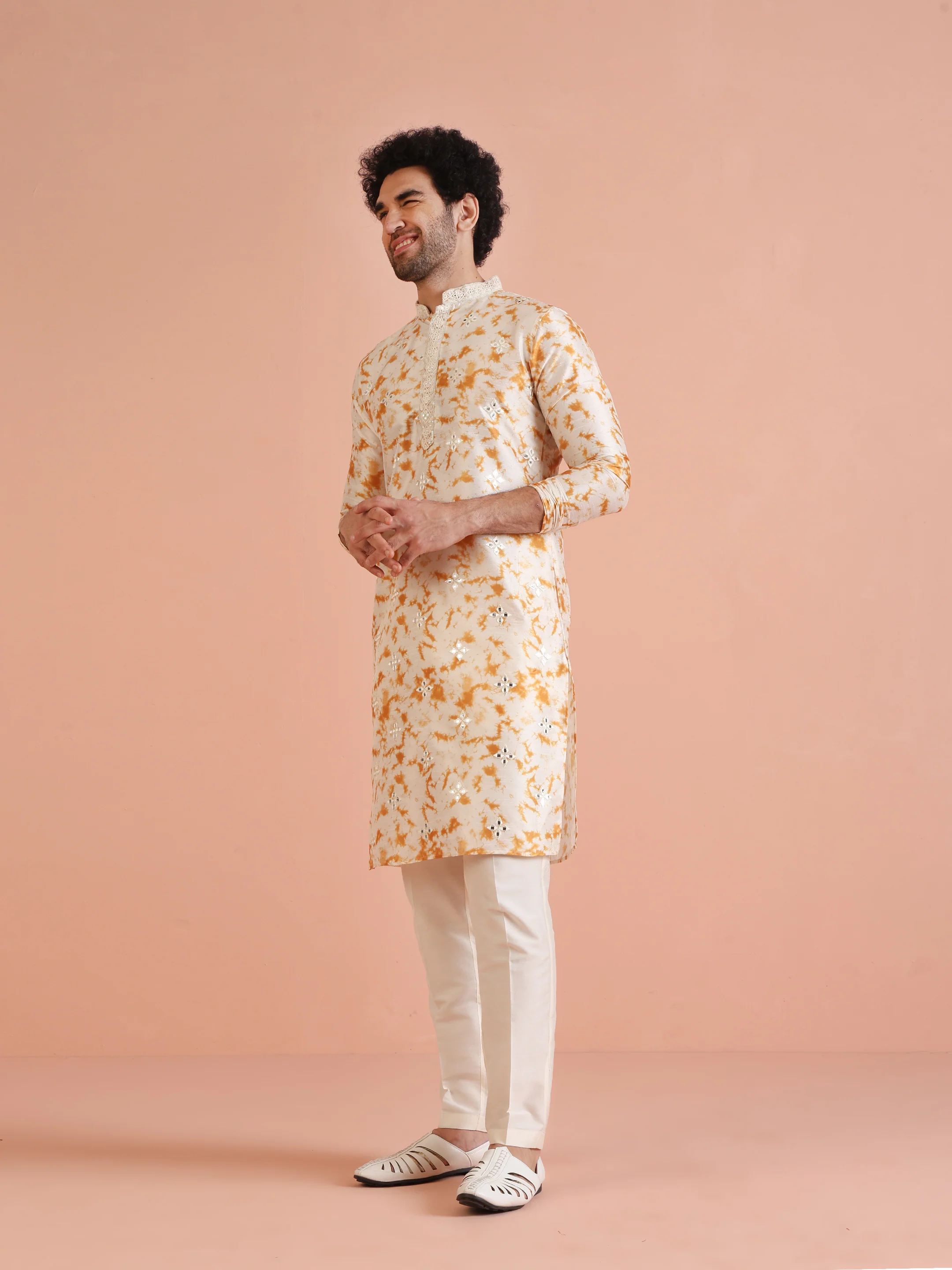 Cream Cotton Silk Mirror Work Kurta Trouser Set