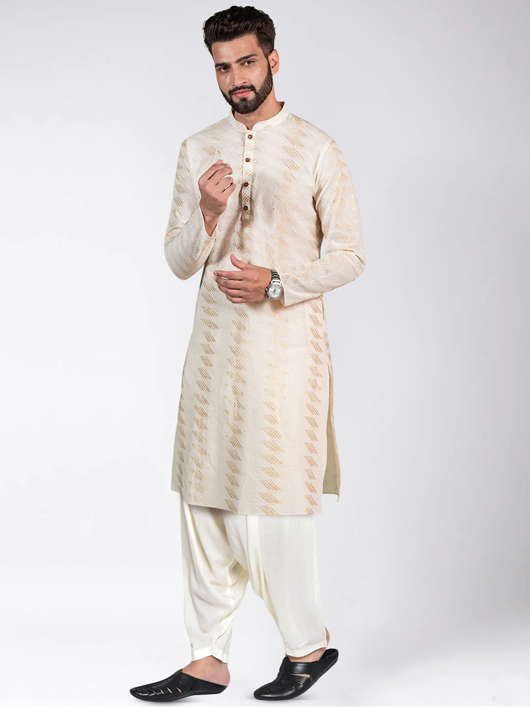 The Kisah kurta Sets is ideal for men looking for stylish yet comfortable attire. Crafted from Cotton Blend fabric, White color, stylish pattern, and comfortable fit make it perfect for festive wear.