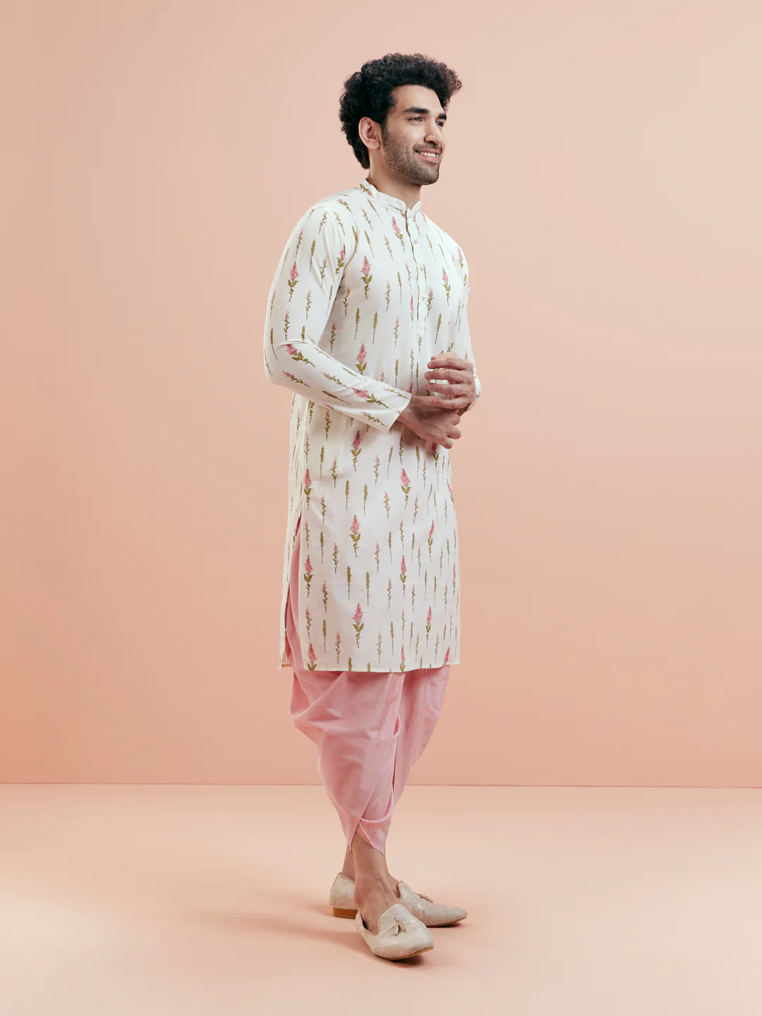 White Cotton Floral Printed Kurta Pink Dhoti Set