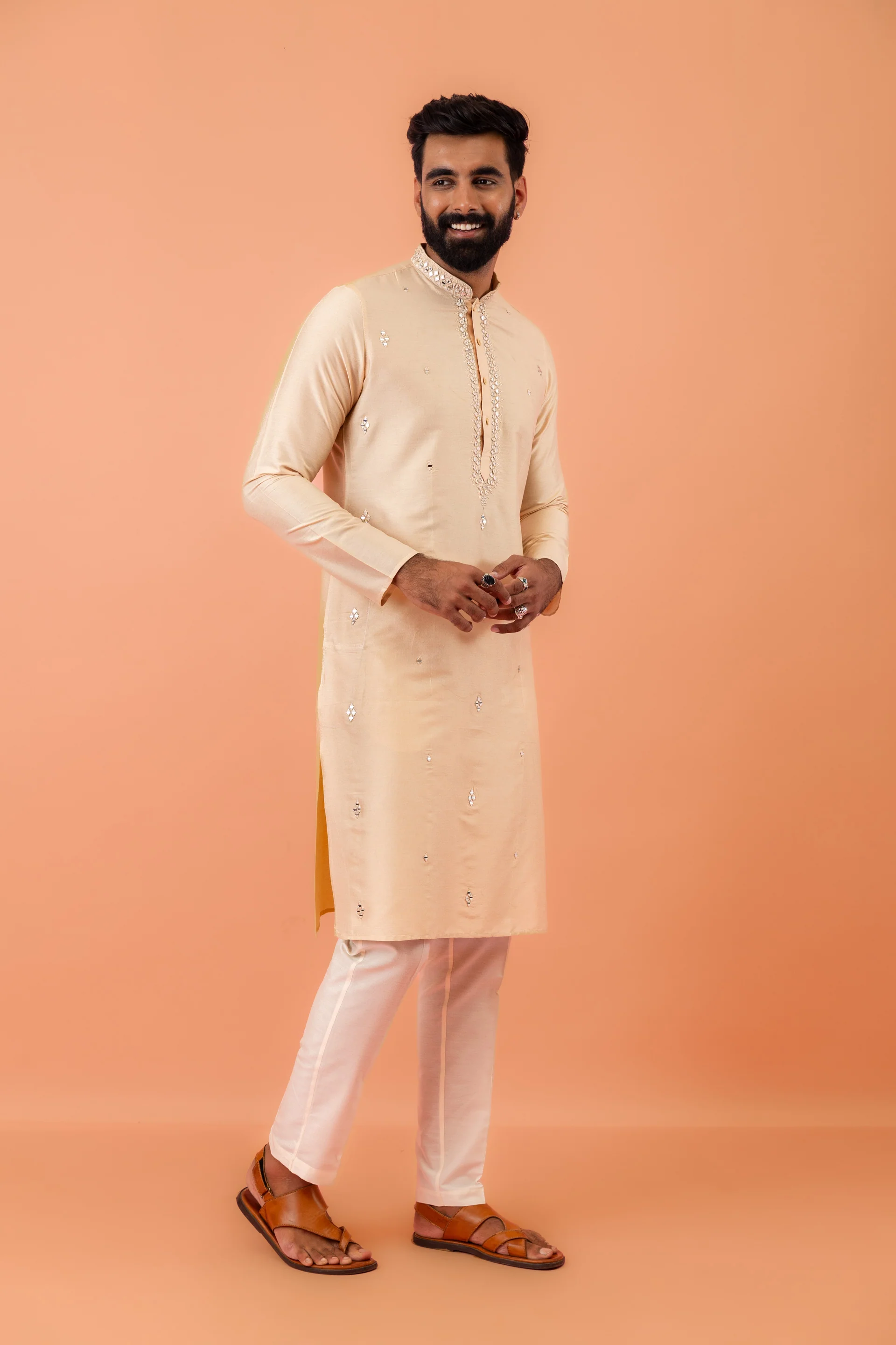 Beige Silk Blend Mirror Work Kurta Trouser