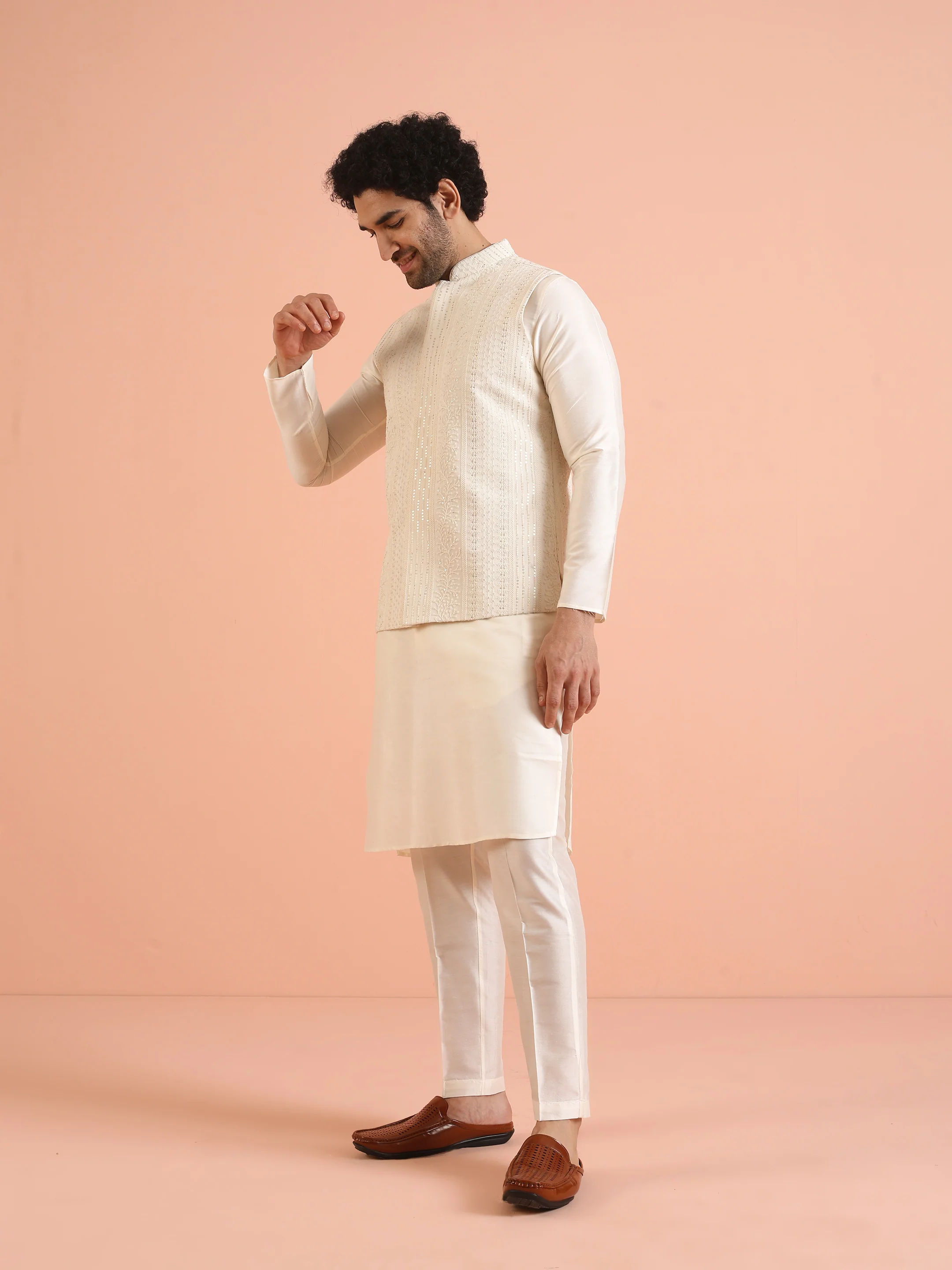Cream Embroidered Nehru Jacket Kurta Set