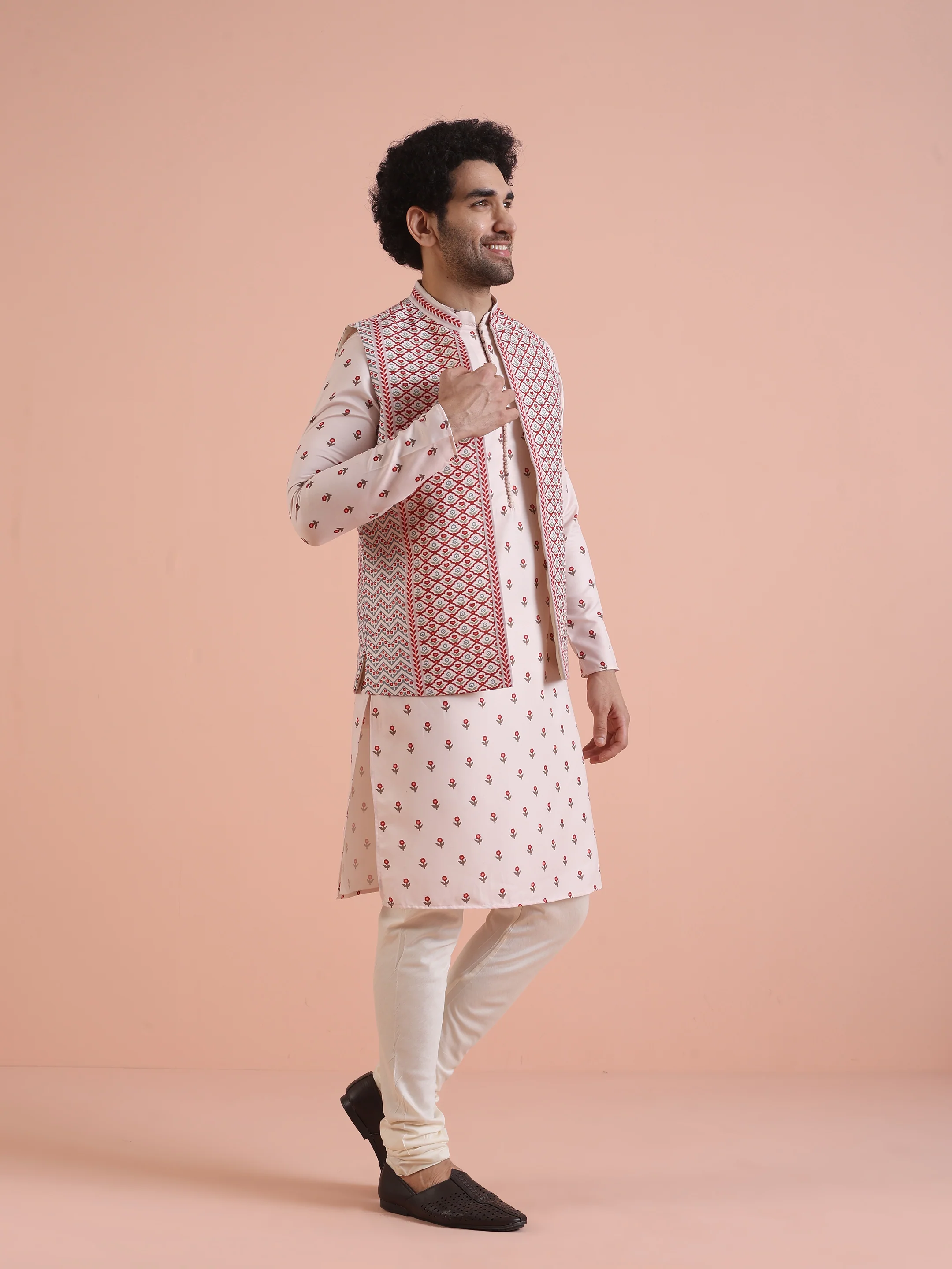 Experience classic elegance with this Men White Printed Floral Kurta Front Open Jacket Churidar Set. The Printed Pattern adds a refined touch, while the breathable Cotton Blend fabric ensures comfort throughout the day. Ideal for festive events or casual wear, this Kurta Front Open Jacket Churidar Set is a wardrobe essential..