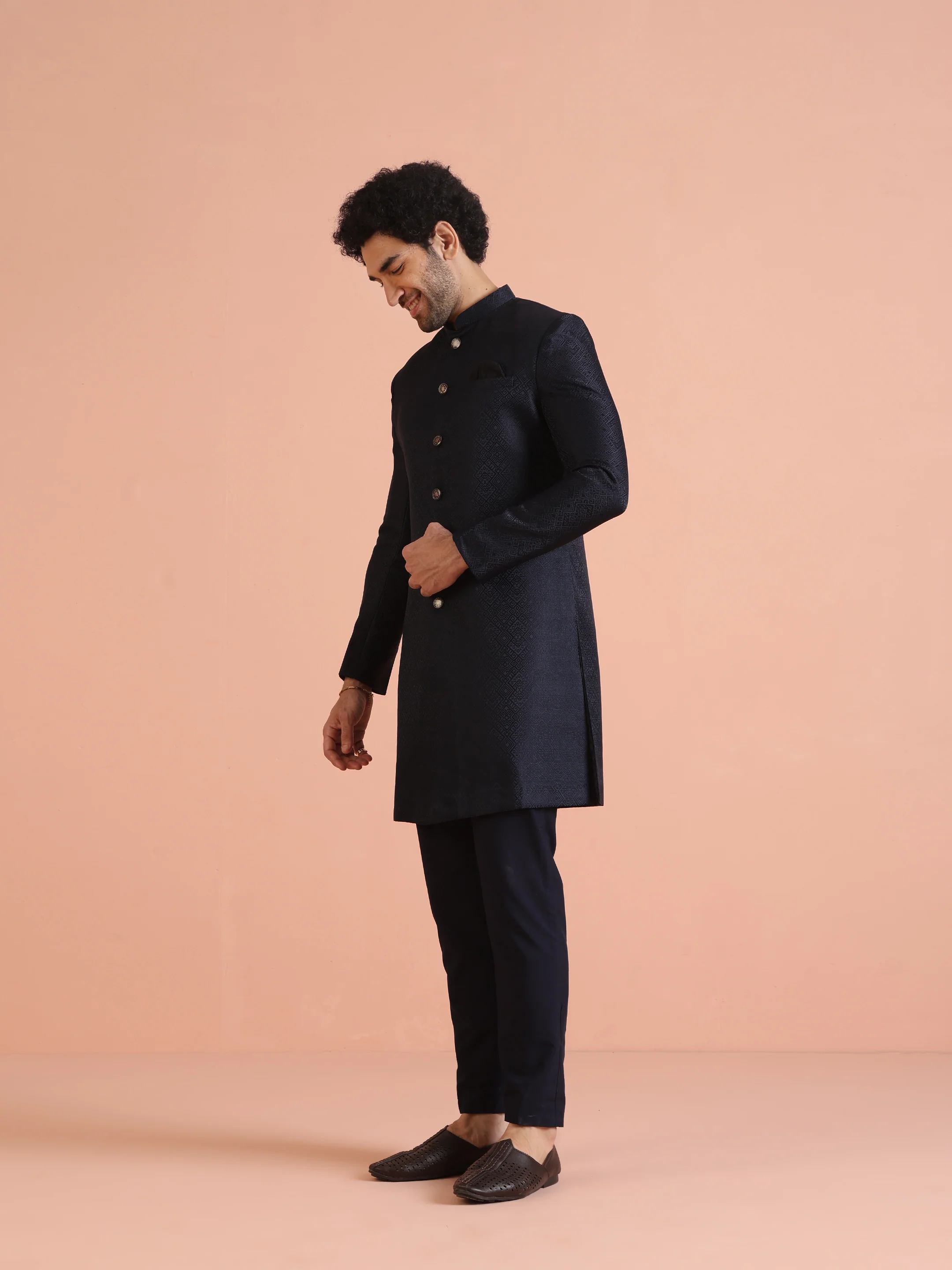 Navy Blue Textured Sherwani Trouser Set