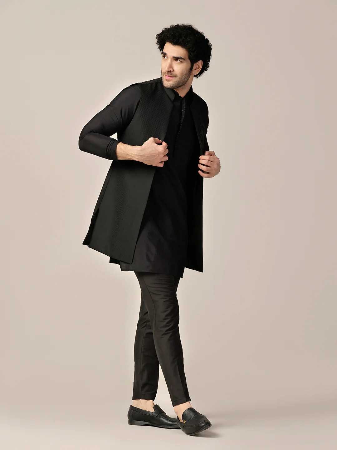 Black Silk Blend Embroidered Jacket Kurta Trouser Set