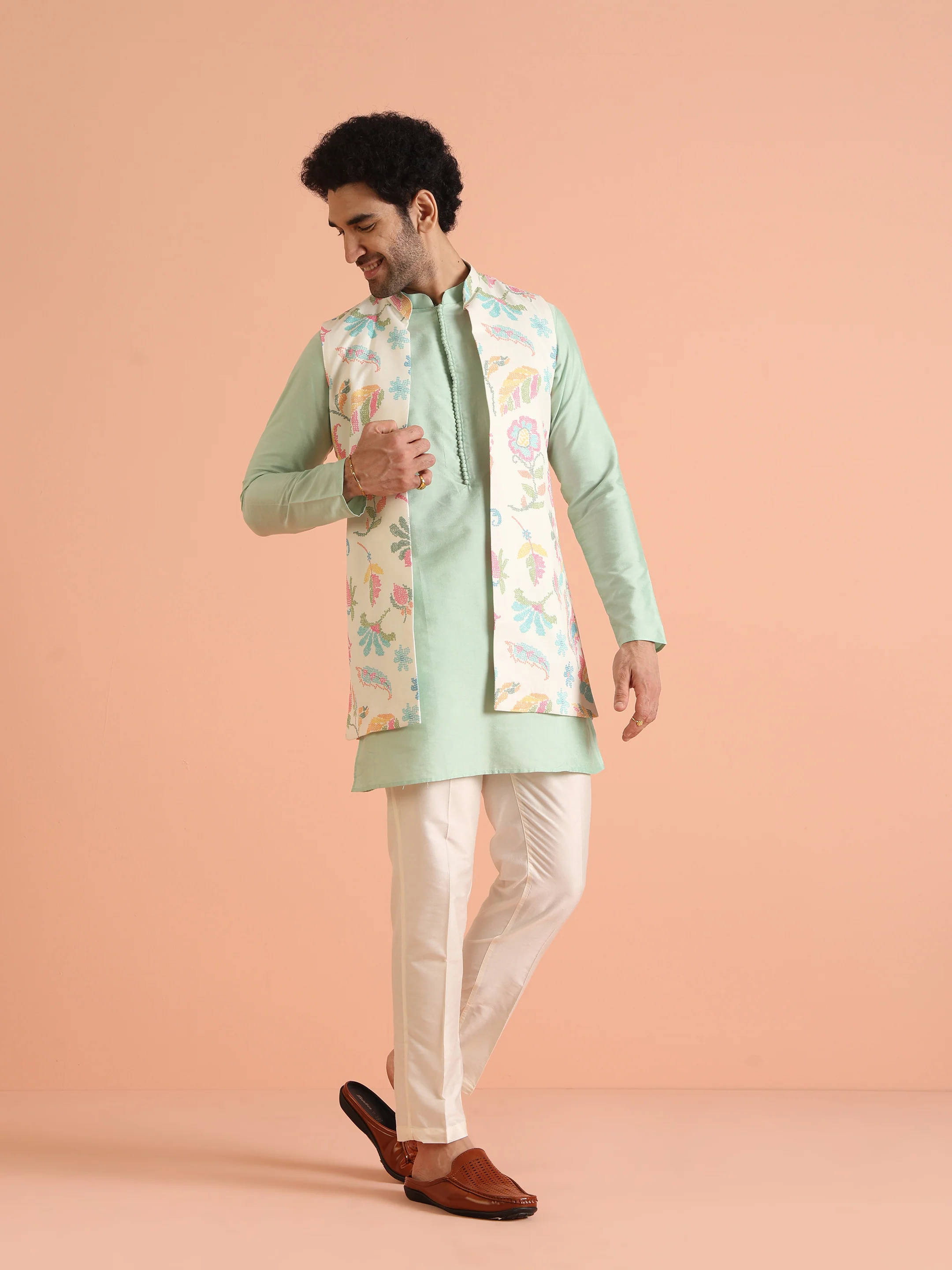 Mint Green Cotton Silk Floral Nehru Jacket Kurta Trouser