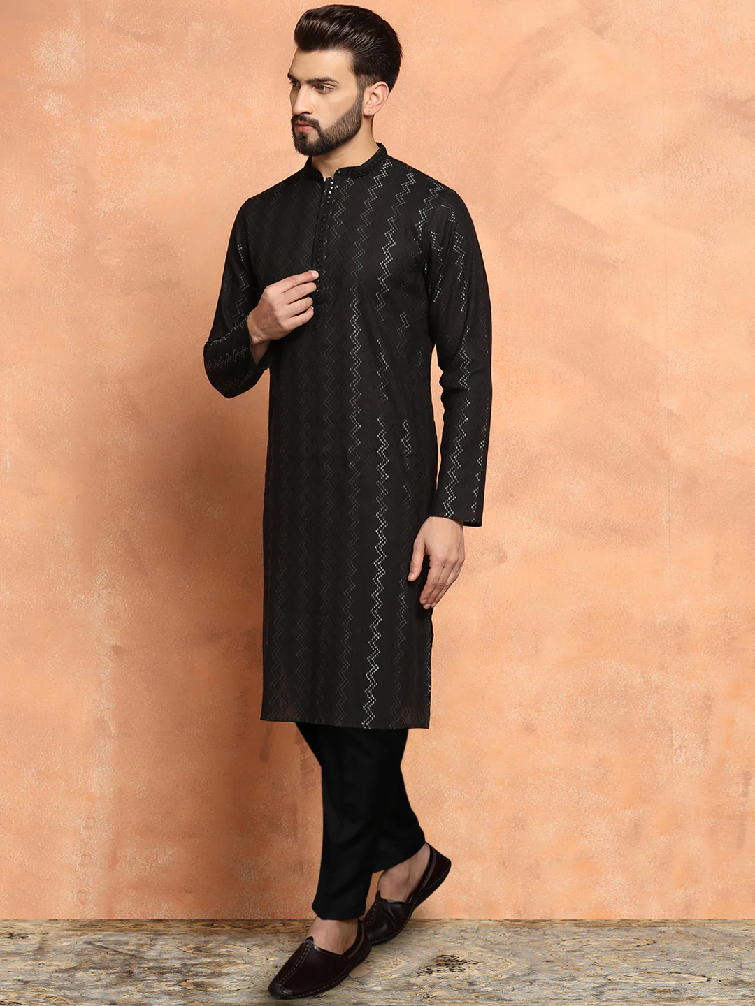 This Kurta Set with Black Color is an elegant mandarin collar style that is perfect for occasional wear. With a full sleeve Embroidered design and comfortable fabric, it will make you look stylish.