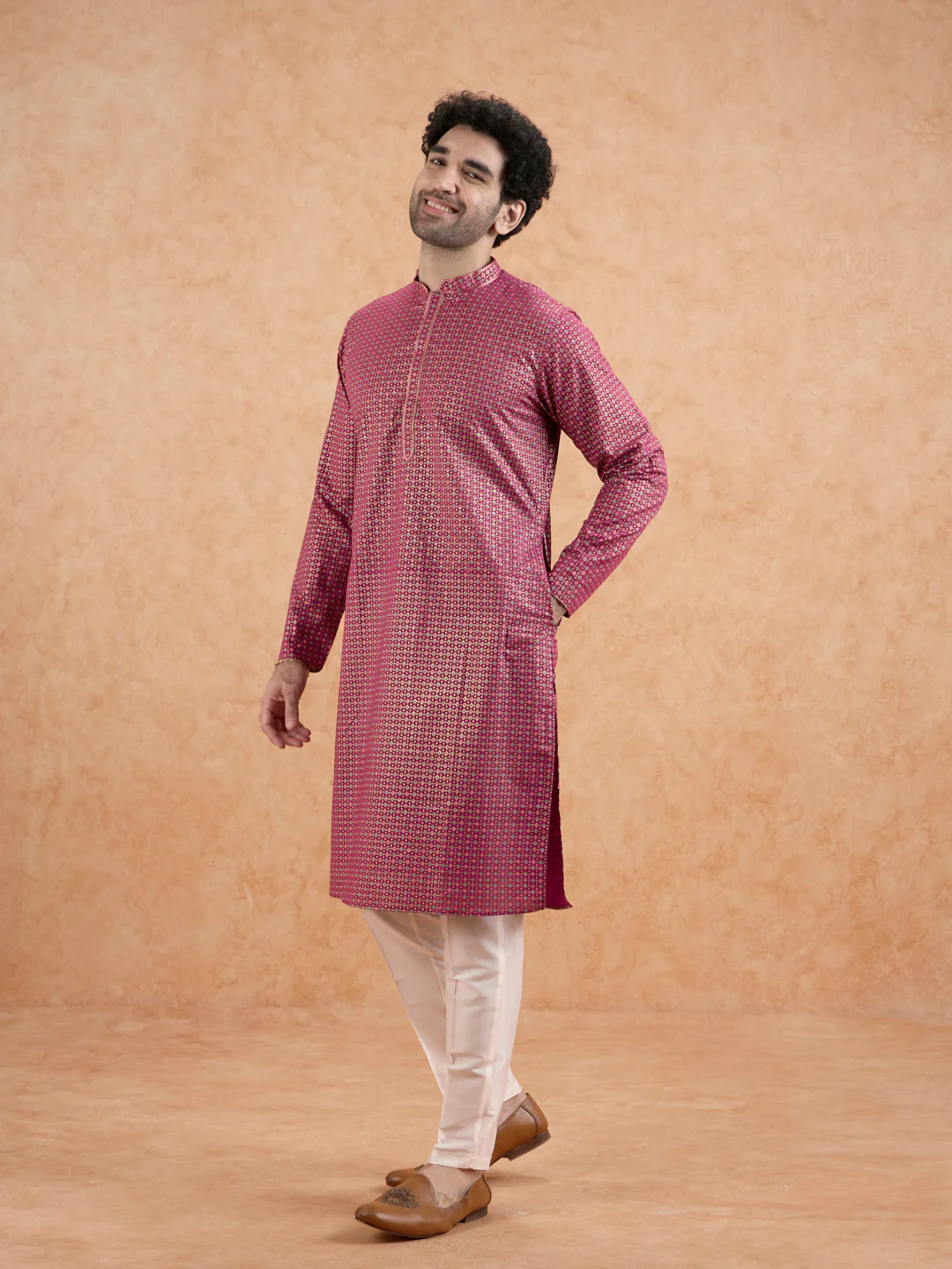 The Kisah kurta is ideal for men looking for stylish yet comfortable attire. Crafted from Cotton fabric, Pink color, stylish Geometric pattern, and comfortable fit make it perfect for festive wear.