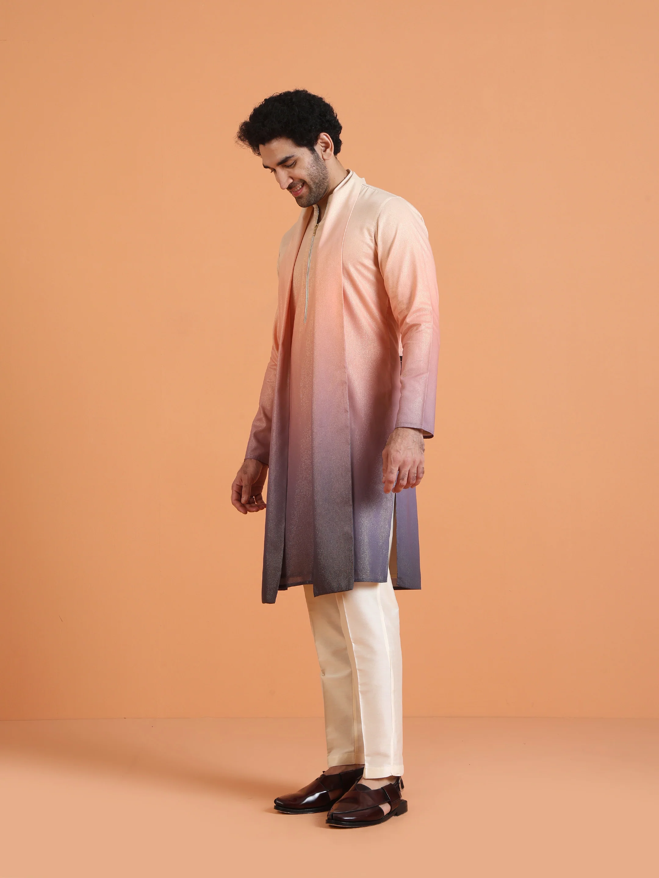 Peach to purple ombre satin kurta with zip closure, metallic finish dupatta, and cream trouser. A festive and modern ethnic set for men.