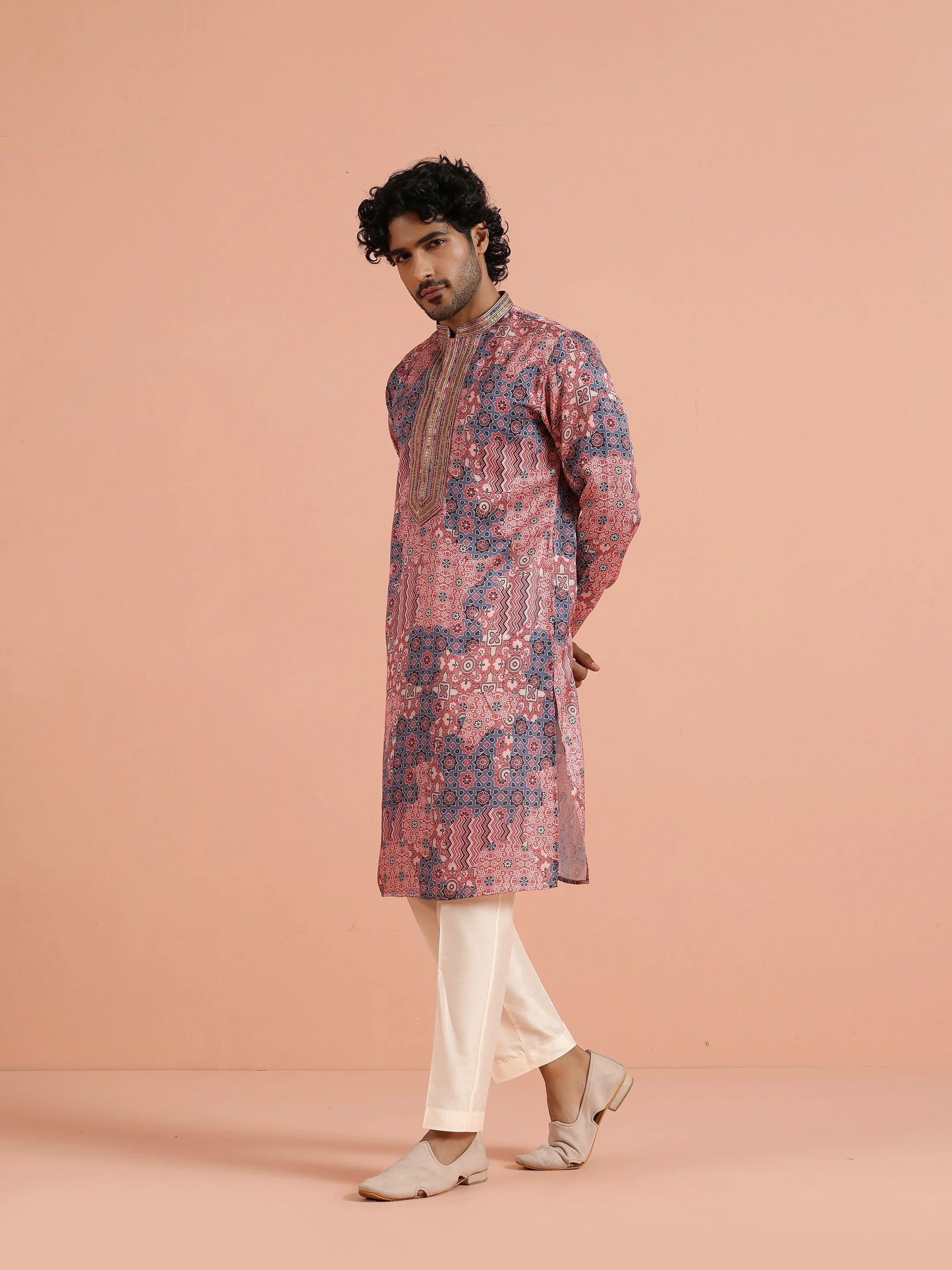 Kisah Menss Pink Polyviscose Printed Kurta with Navy Accents & Sequins Placket, paired with Cream Trouser Elegant kurta trouser set for weddings, receptions, and festive occasions.