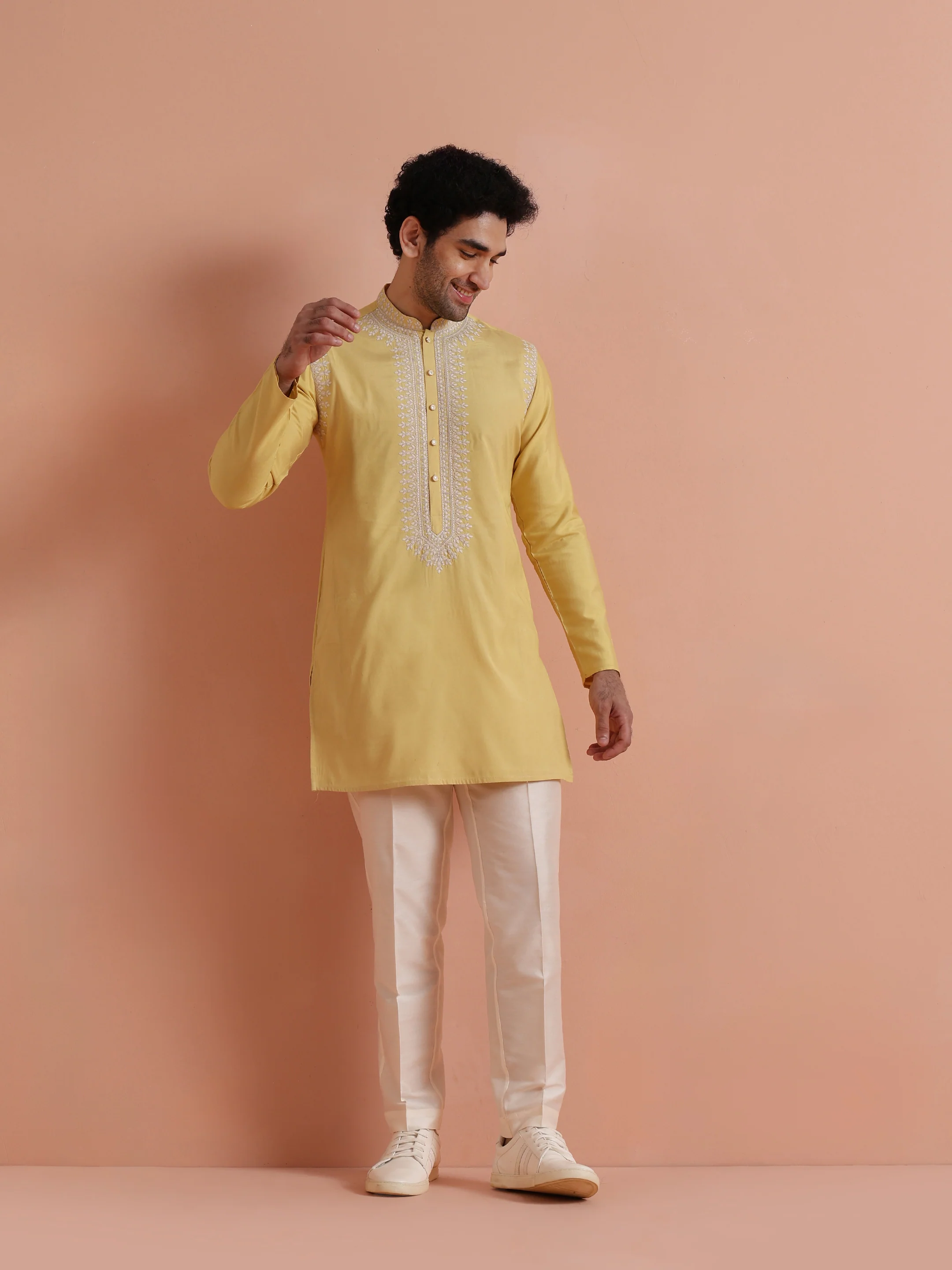 Bright yellow embroidered poly silk mid kurta by Kisah. Perfect festive wear with elegant neckline detailing and comfortable fit for celebrations.